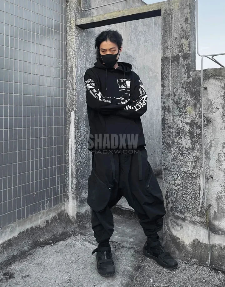 Beyond its aesthetic appeal, the Black Cyberpunk Utility Hoodie offers practical functionality. It's a garment designed for the contemporary techwear enthusiast who values the intersection of performance and style. Its spacious pockets, adjustable hood, and utility loops underscore a design philosophy where every element serves a purpose.