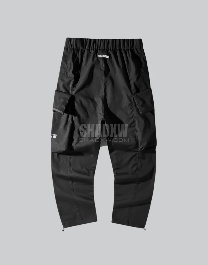 The signature logo - a sharp, angular design - is tastefully placed, adding to the pants' distinct techwear charm. Each design element, from the adjustable waist to the minimalist white iconography, serves a dual purpose – enhancing style while ensuring functionality.