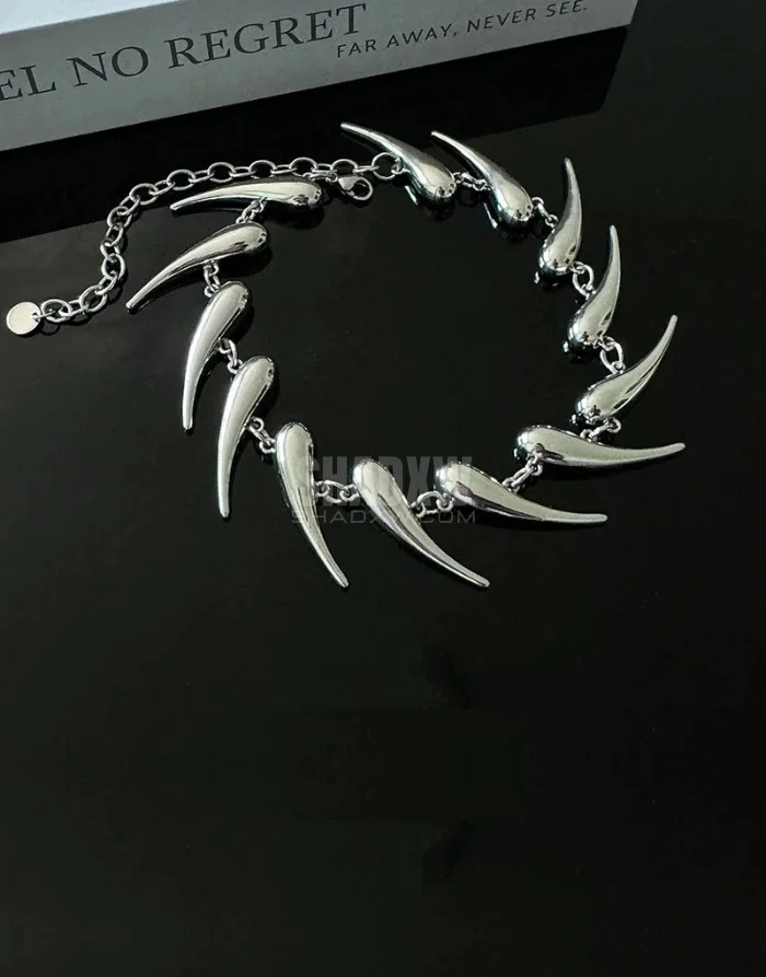 Unleash your rebellious side with the Spiked Choker Necklace, a statement piece crafted to embody grunge aesthetics. Crafted with a bold vision, this necklace showcases a sequence of elongated spikes arranged symmetrically to contour the neckline perfectly. The fluid curves of each spike add dimension and movement, while their pointed ends channel an intense, commanding energy. The design mimics the raw edge of nature—evoking thorns, talons, or fangs—yet it maintains a sleek, modern silhouette that works with both streetwear and high-end fashion.