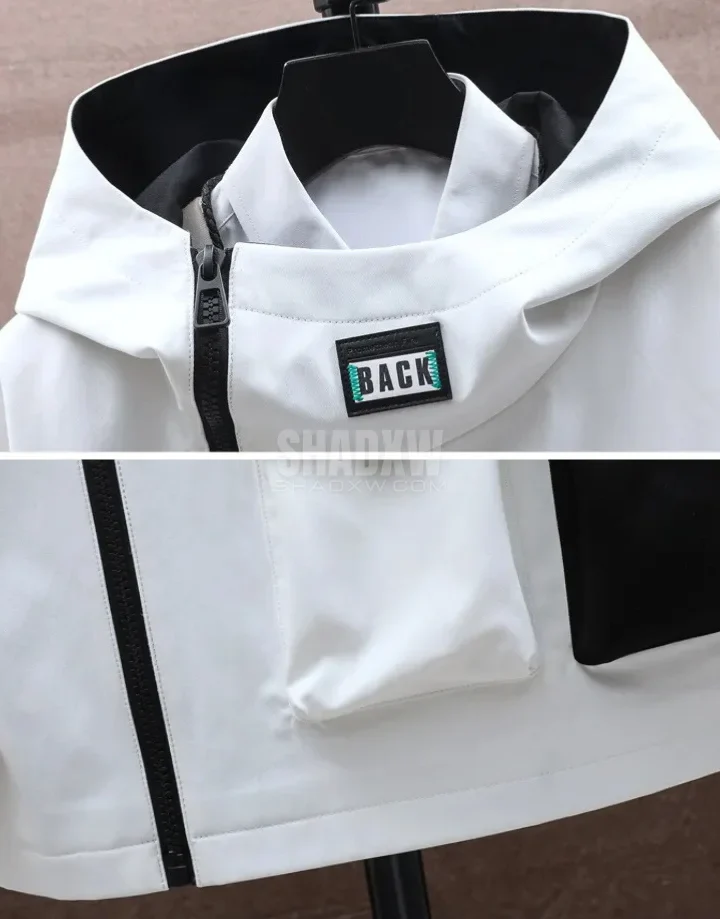 The White Techwear Jacket offers a striking visual appeal with its pristine color that stands out in the urban jungle. Its high-collar design and oversized hood not only add to the visual drama but also serve to protect against the harsh whims of nature.