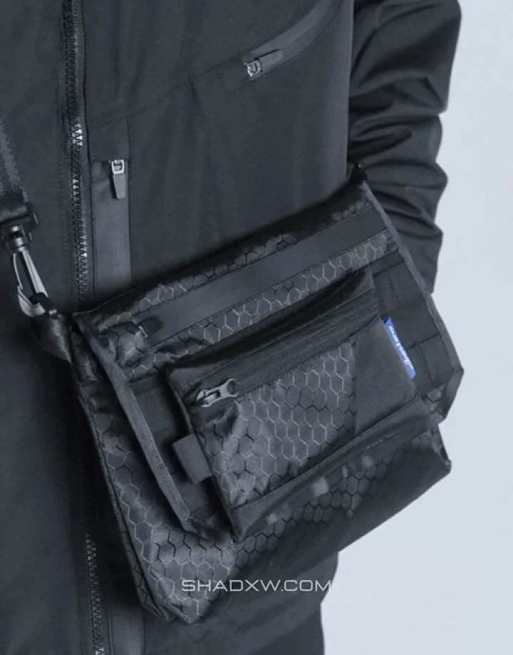 Practical and light to store your phone, wallet, or even your techwear mask, this shoulder bag is a must-have techwear accessory. Useful to carry the essentials of everyday life, it features a futuristic design inspired by the world of science fiction. It is made of resistant nylon with a honeycomb pattern.